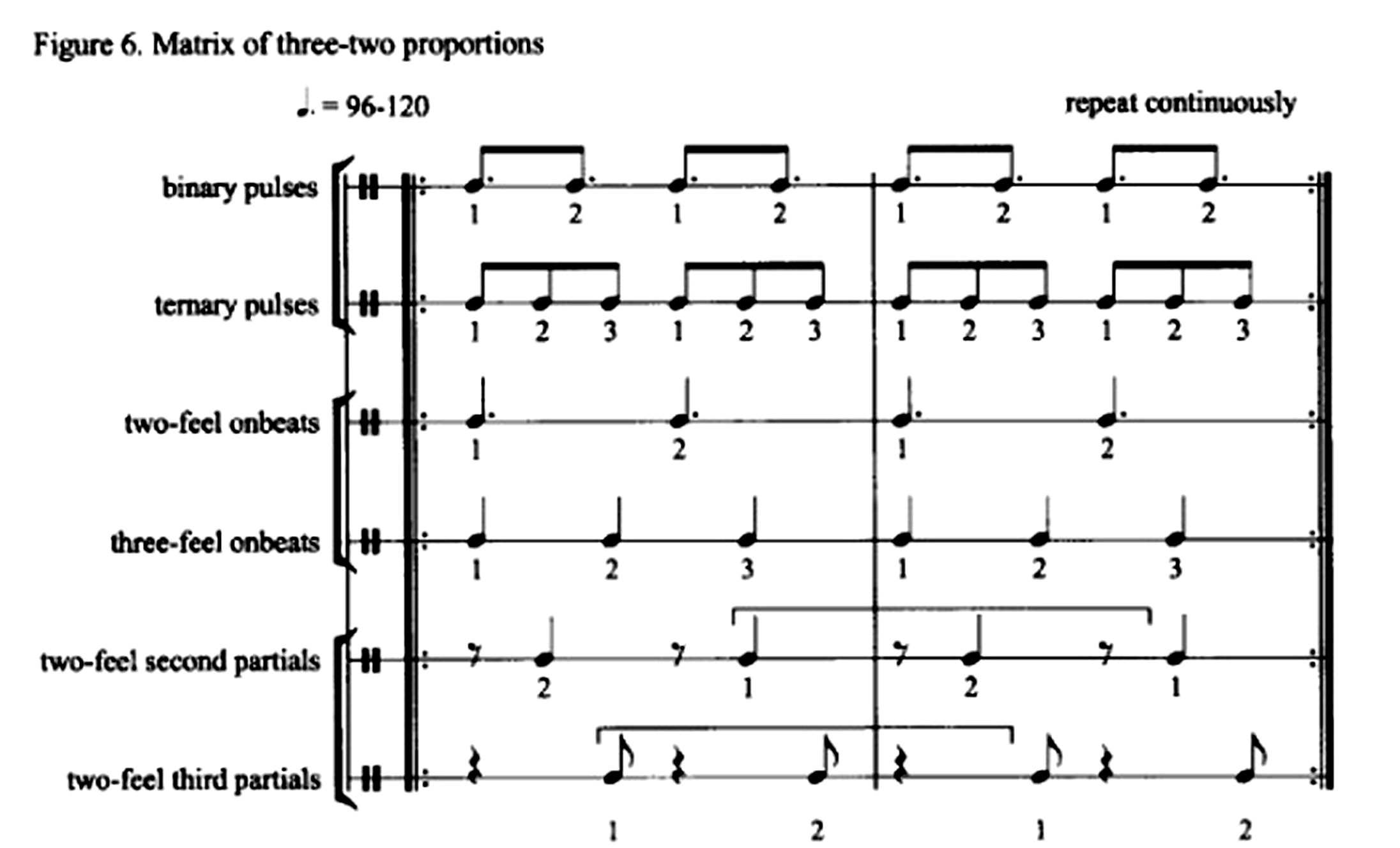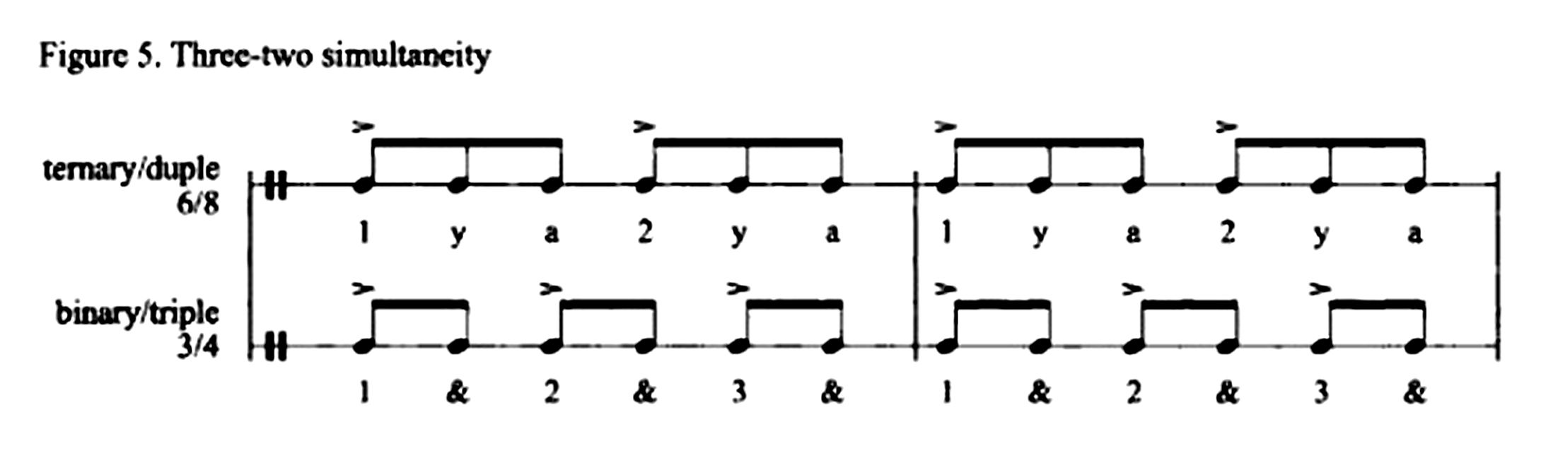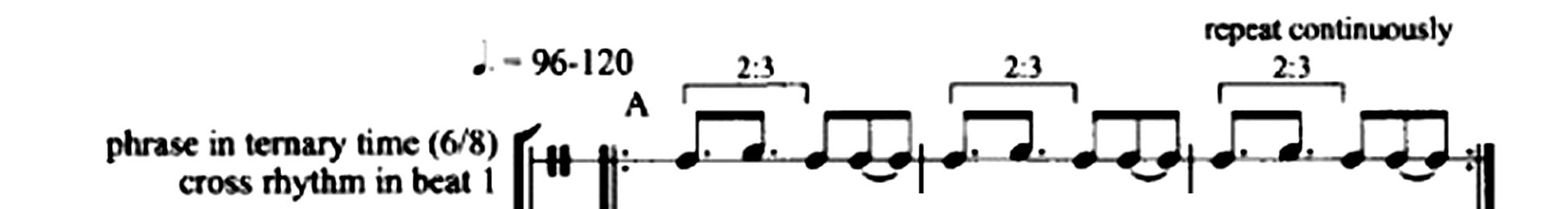 Vocables appear in the lyrics area below the staff. Above the staff, brackets mark the beginning and ending of phrases, which may or may not coincide with the bar lines. Bar lines shape the flow of time into spans of six pulses. Within the measure, time is felt as a three-in-the-span-of-two simultaneity (3:2) represented as the interaction of three, binary, quarter note beats with two, ternary, dotted quarter note beats.[13]Clarity of technical terminology surely helps when writing about music. I use the following naming convention for designing the metric function of beats: down-beat – pulse one in the measure, on-beat – first pulse in a beat, off-beat – any position within a beat other than pulse one, up beat – midpoint between successive on-beats, back-beat – on-beat two in a two-beat measure and on-beats two and four in a four-beat measure. The suffix “-ary” serves to denote the quantity of pulses within a beat, that is, ternary time has three pulses per beat, while binary time has two pulses per beat. The suffix “-ple” is reserved to denote the quantity of beats per measure, that is, duple, triple, quadruple and sextuple time signals two, three, four and six beats per measure, respectively. Moving twice as fast as dotted quarters (2:1), dotted eighths imply two-in-the-span-of-three (2:3) interactions with the eighth note pulses and four-in-the-span-of-three (4:3) interactions with the quarter note beats. Rests visually mark on-beats on which a drum stroke is not played or, in analytic figures, help clarify an aspect of musical interpretation. The music is assumed to recur steadily at the tempo indicated.