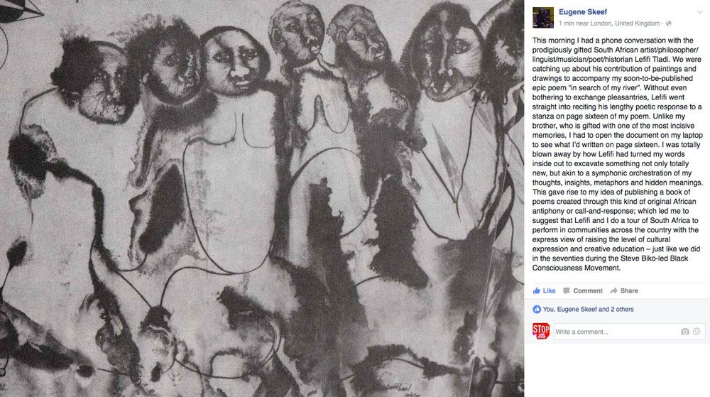 Then, many years later, when Lefifi had returned to South Africa and I was still in London, I arranged for my niece Noelene to deliver the manuscript of my symphonic poem ‘in search of my river’ to him in Pretoria. I had always wished for us to publish a book of my poetry and his drawings as a testament to our long creative association. The idea did not germinate, due to the social strains on Lefifi’s life at the time. So we let the concept fade into a long silence…