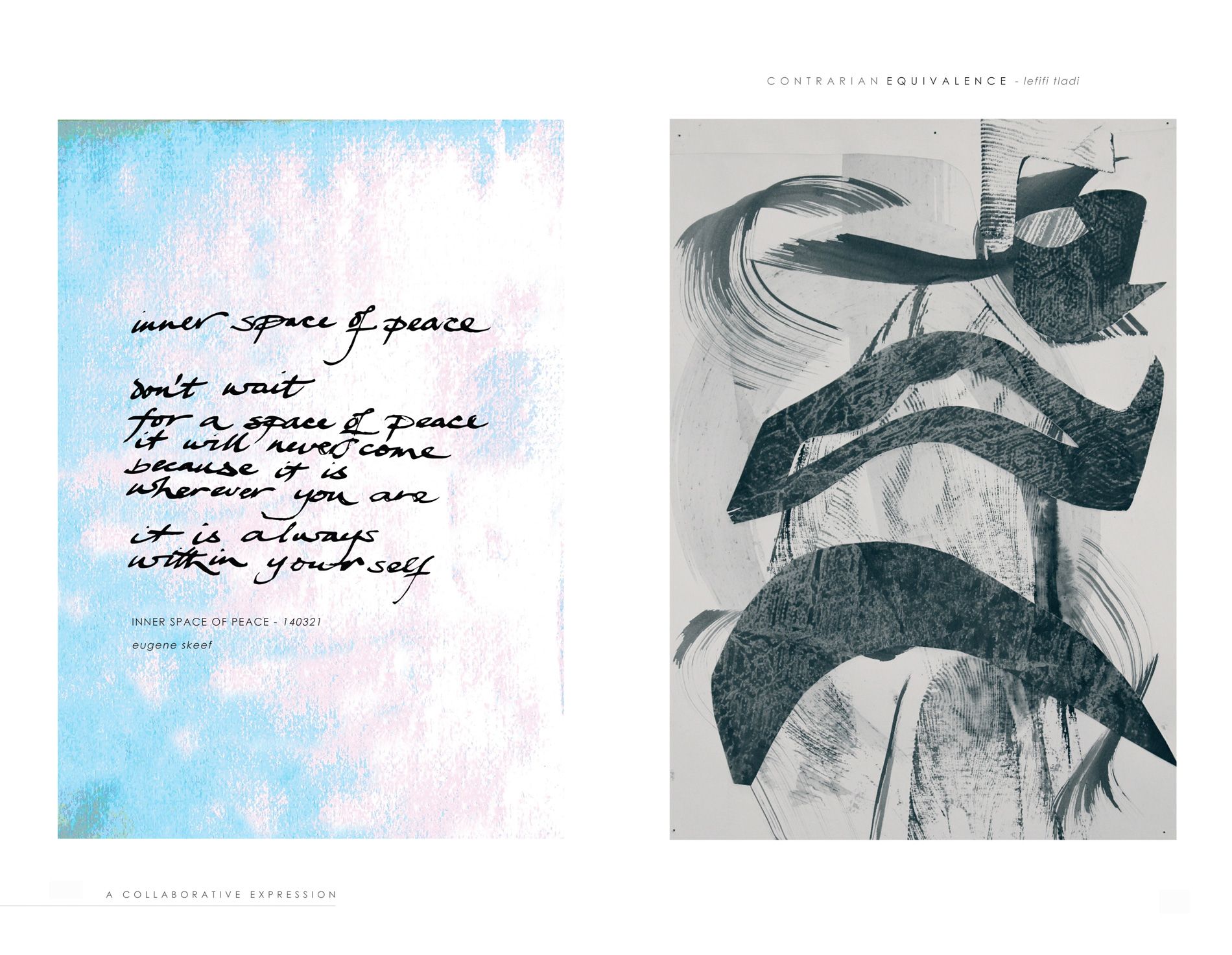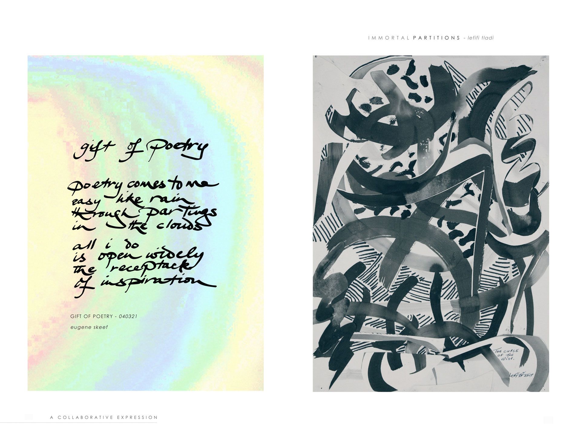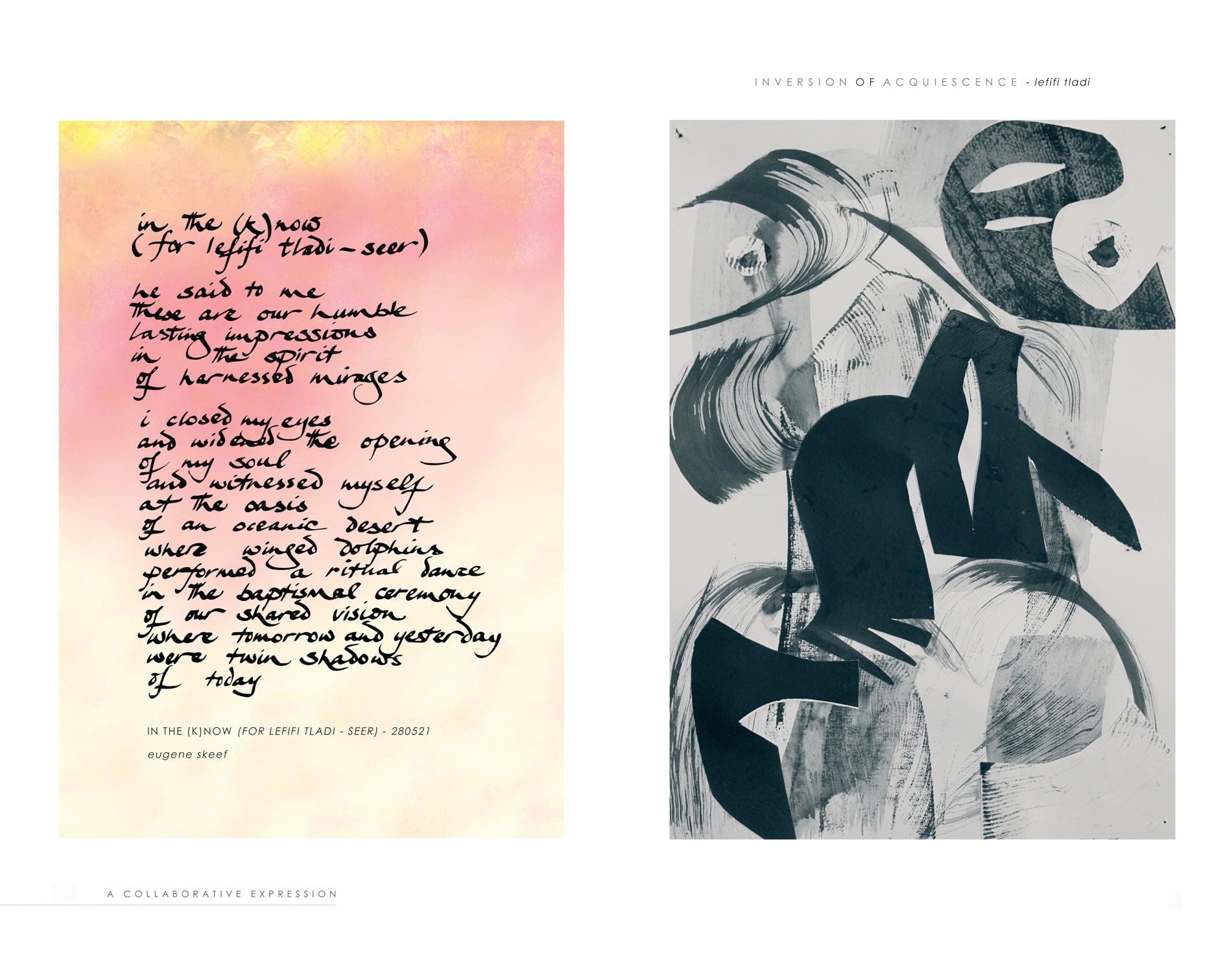 We arrived at the estuary of our collaborative expression, with all its alluvial riches from the long flow from the headwaters of our shared history in the 1970s, during the Covid-19 coronavirus lockdowns of 2020. Lefifi and I immersed ourselves in producing daily pieces of ink collages and handwritten art poems respectively. We shared these with our global “followers” on our social media platforms.