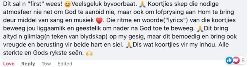 Al die musicians wat in die recording participate het se spirits is agterna hoog. Ek bedank die studente vir hulle valuable contribution tot die verrigtinge en tot die broader landscape van musiek in die gebou. Hulle bedank in turn vir my vir die opportunity om deel van so iets te kon wees. If you need me again for something like this, ma’am, please let me know, sê een van die studente aan my. Die volgende paar weke wag ek vir ’n notification van een of ander aard oor dat die video gepost is, maar niks. En ek vergeet daarvan. Twee dae voor Kersfees tag ’n student my op Facebook, en ek raak koud. Ek stuur die link van die video aan die participants en vra dat hulle dit maar distribute, want ek gaan definitief nie. Ek is hopeloos te selfbewus en vreeslik ongemaklik oor sulke goed. Ek notice eventually dat die student die link na die YouTube video op die US se Facebook page gesien het. Ek sien daar is alreeds comments en is nervous om dit te lees. Maar ek is pleasantly surprised deur die positiewe feedback. Twee comments staan vir my uit, twee comments wat net weereens my argument versterk dat dit nie saak maak hoe ons die koortjie wil package en promote nie, die koortjie word eerstens met die kerk connect, en dan met die kultuur.