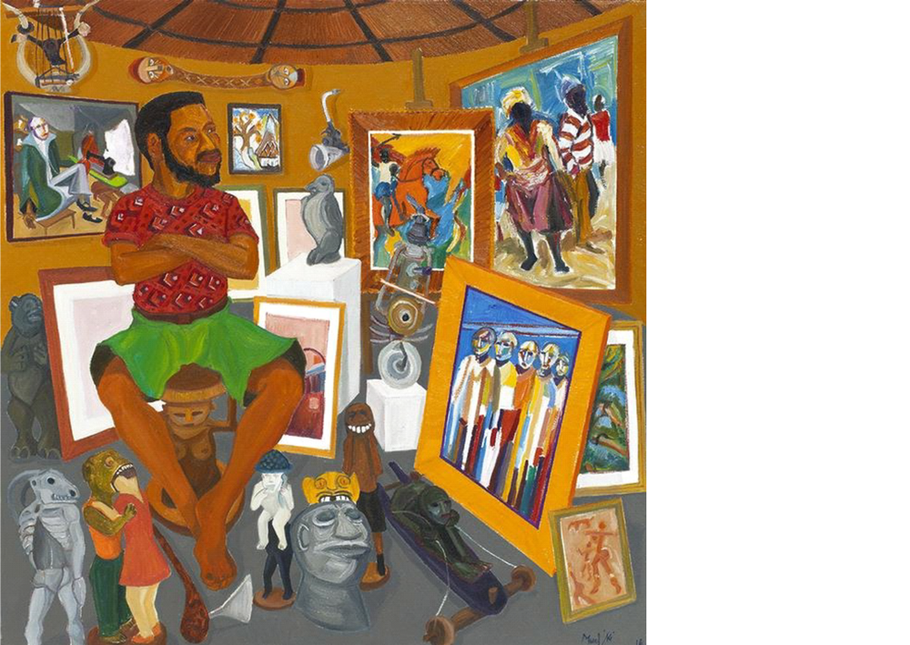 Wherein an African man sits proudly inside a hut full of artworks: the painting is a statement about both Zimbabwean art as well as Mudariki’s place in it. It is a conversation across generations, historical contexts, ethnic lines, locations, mediums and art styles. Some of the referenced works are allegorial in subject matter, others clearly carrying a political motive, there is Fauvist colour use and a pastiche of Khoi-San cave figures, as is the vigorous but kitschy tableau of “Township art”, even what looks like face masks on the wall, most of the artworks being framed paintings and wooden sculptures, though a gardening hoe can be seen, ditto cultural artefacts. It is an idealised image of the hut as the intellectual home of a nation’s visual archive, a centre of knowledge production accorded the kind of institutional significance that is usually reserved for the museums of the metropolis. The hut as an art gallery.