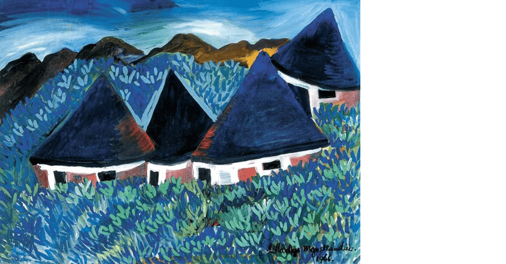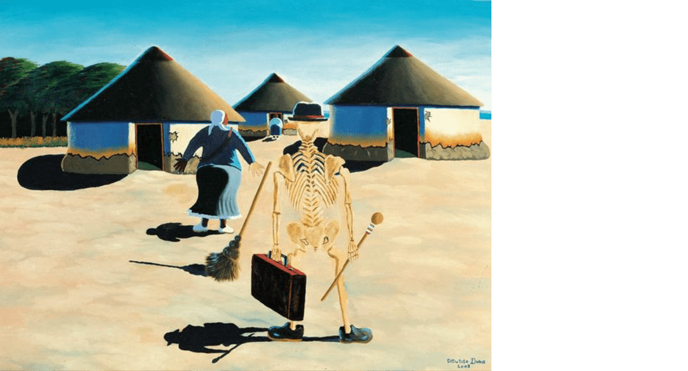The idea of a “living skeleton” is both humourous and unsettling. Dressed in nothing but a hat and shoes, in broad daylight nogal: is this a man who has returned home from the city close to death or the unappeased spirit of a dead loved one wandering back into the world of the living? The ghost sits comfortably between objective reality and the supernatural in ways that ring true of the superstitious nature of rural life. The women both have their backs to us (so that we cannot read their expressions of either terror or indifference), just as with the skeletal figure (whether he is leaving or arriving, we cannot tell). What’s in the briefcase and is that broom in front of the skeleton floating on its own? There seem to be no windows in the huts (hence the creeping air of doom that suffocates the interiors), just as the positioning of the “ghost” conceals his eyes and other facial features from us. In Duma’s painting, the rural is a stage on which a theatre of domestic drama is continuously performed and The ghost is a scene where more than one reality is affirmed. The hut, even as a prop, carries a double meaning — as home and jumping off point, as refuge as well as economic status, familiar and also made mysterious, where both women and men come to find or lose themselves. The hut is, to return to my first impressions of Sikade’s album, given a multiplicity of meaning denied by the cover of Umakhulu.