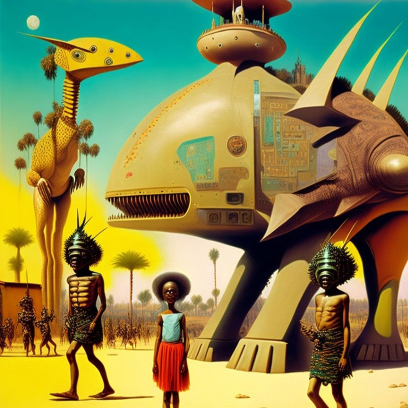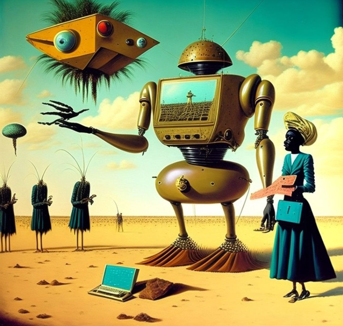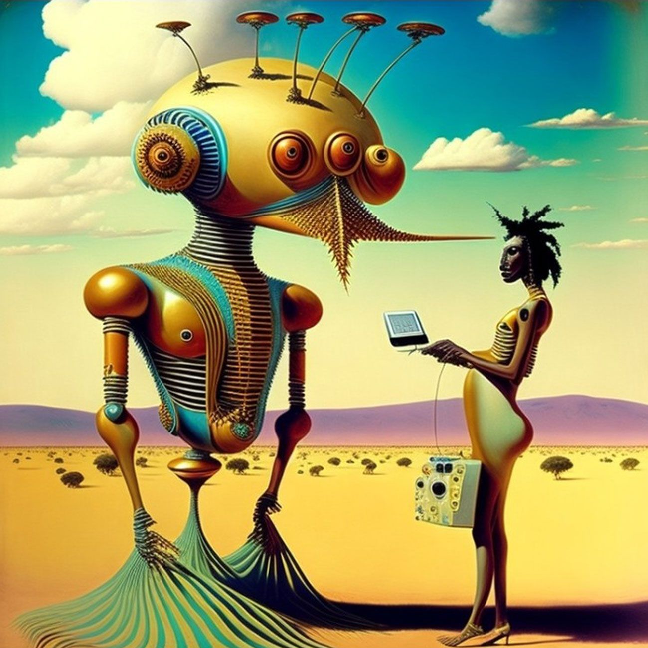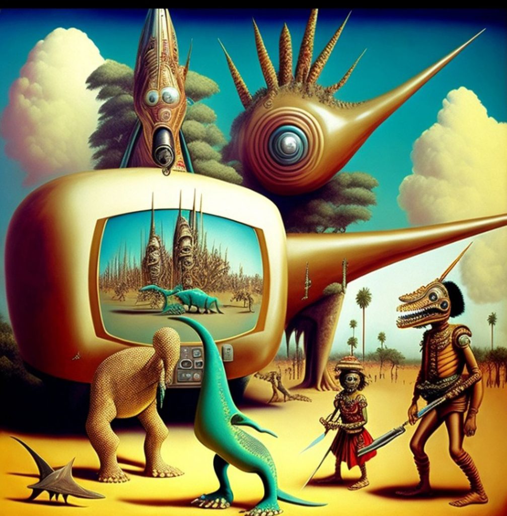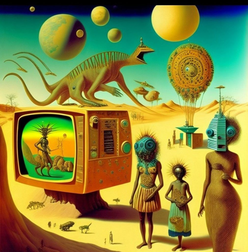The Series How to Fight the Robot Army and Win? seeks to critically investigate the role of A.I and Surrealism in afro-electronic studies: Virtual bands and mythsciences in Immersive multimedia experiences. I use A.I Generated Images inspired by Afrosurrealism ideology, Immersive technology and telecommunications. I aim to create a multiverse based on a virtual art collective inspired by influences from Brenda Sisane, Credo Mutwa, Sun Ra, Alejandro Jodorowksy, Salvador Dali, Fela Kuti, Damon Albarn, Genesis P. Orridge and various Jazz musicians, Mystics, Counter Culture Narratives, using various digital tools with small devices to explore new epistemological discourses and sound inquiry.