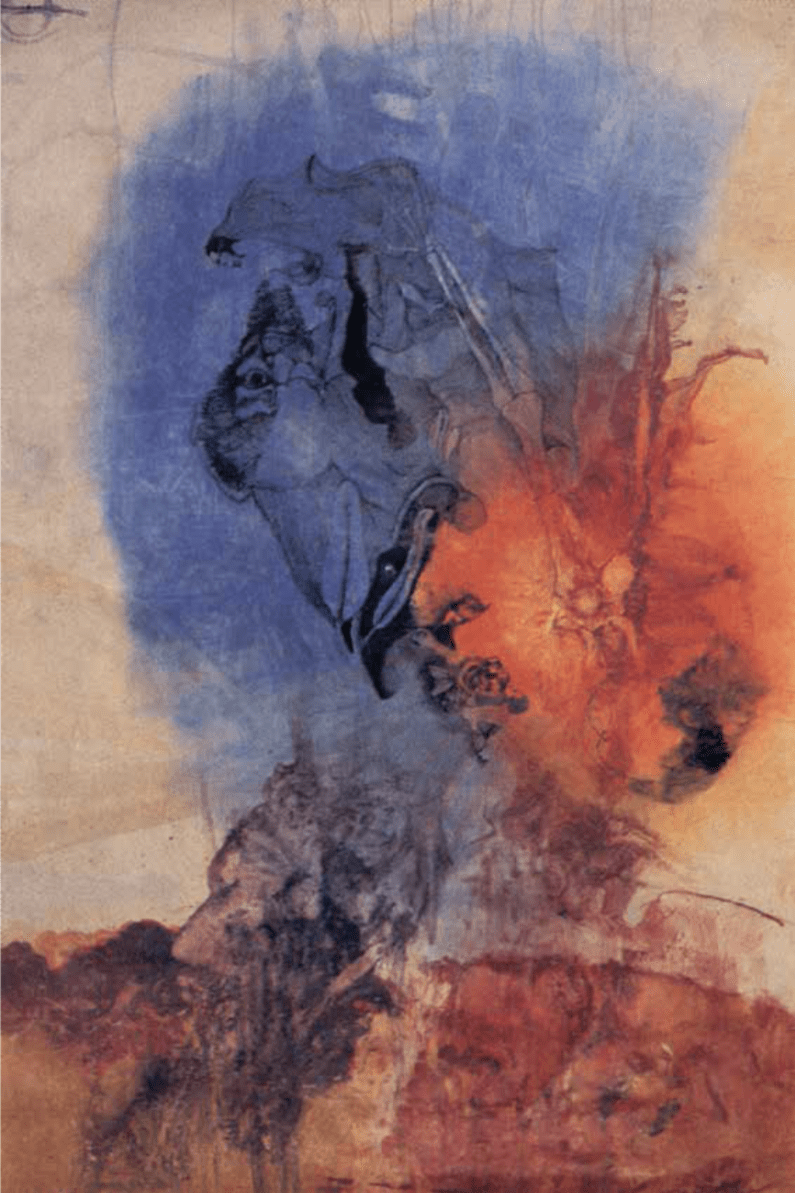 Technical experimentation and abstraction are themselves indicative of Black Consciousness at work within Mashiangwako, Tladi, and others with whom they regularly worked. Three works reproduced here evidence a common technique that infuse the artists’ very being onto the paper: drawing a deep breath, they would blow ink and bleach across the page to effect varying depths, shapes, and degrees of colour. They would also press their fingers and hands into the ink. The bodily traces are thus both concrete and given to chance, and they infuse life into compositions that frequently respond to trauma, if not death. Magadlela’s Remind Me Not is one such work.
