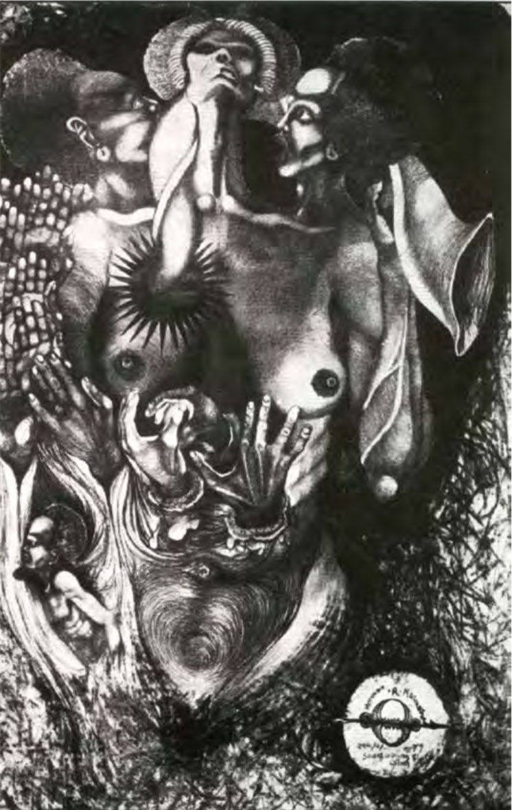 This brilliance is resolutely an expression of Black Consciousness. It is in keeping with Magadlela’s view: “There’s one thing I believe in: If you draw a black man, he must be beautiful, handsome; the woman must be heavenly. Drape them with the most beautiful clothes.”[20]Fikile Magadlela, “Staffrider Profile: Fikile.” Staffrider 3. no. 2 (1980): 25. Whether larger than life or small as a palm, the figures drawn by this talented draftsman were always self-possessed, determined, composed. In practidng an art that was in every way a vehicle to express personal conviction—recall that he said, “Black art is an important facet of Black Consciousness and Black artists are very conscious of their heritage”—Magadlela reinforced the African foundation of his practice.[21]Ibid. Tladi and Mashiangwako similarly underscored their works’ origins and eschewed comparisons with surrealists of the North.[22]Ibid., 32, 53. What arose in this time and place was not experimentation that lent itself to surrealist aesthetics, nor fruitful comparisons with modernist masters in Europe; rather, theirs was a rich exchange with transnational blackness at its core.