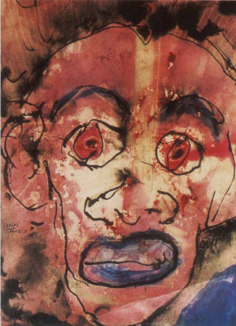 Like Mahlangu, Mashiangwako and Tladi also left South Africa to train, although they chose to fight with the pen and brush rather than with firearms. Tladi chose exile in Gaborone, Botswana, soon after the June 1976 uprisings, as the state’s violent response to Black Consciousness activism left one hundred thirty protesters dead in the first week alone. By the time Biko died on September 12, 1977, a thousand more had been killed and twenty-one thousand detained.[30]Marx, Lessons, 69.. Read Tladi’s Portrait, a closely cropped, urgently drawn face defined as much by line as by the colorful ink staining the paper beneath it, in this context.