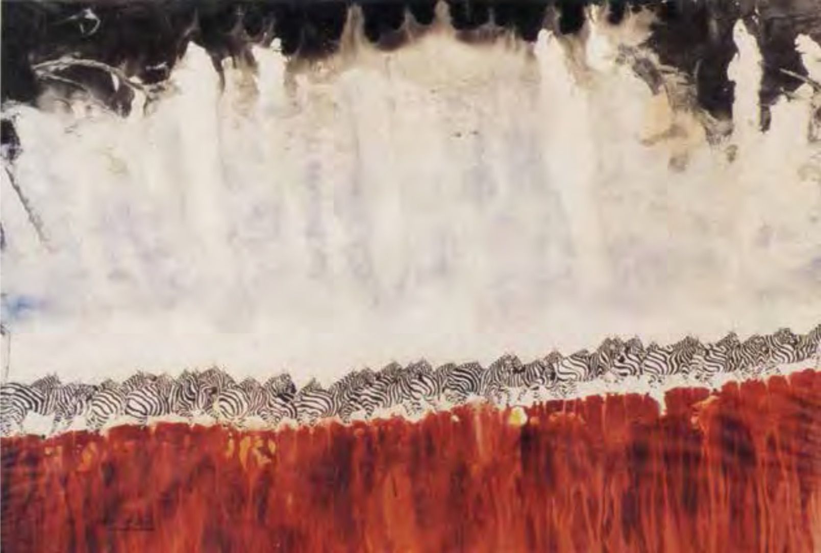 The patterns of zebras are entirely unique; individual patterns are akin to human fingerprints in that no two are alike. In For Batswatta and Botswana, they gallop rightward, each muscle and mane finely detailed, a collective bent towards a goal: reaching the Makgadikgadi Pans after the rainy season. They tread upon red earth, which marks the location of their annual trek, and the sky above is a mottled mass of azure and cream, created by blowing air over ink already applied to paper.